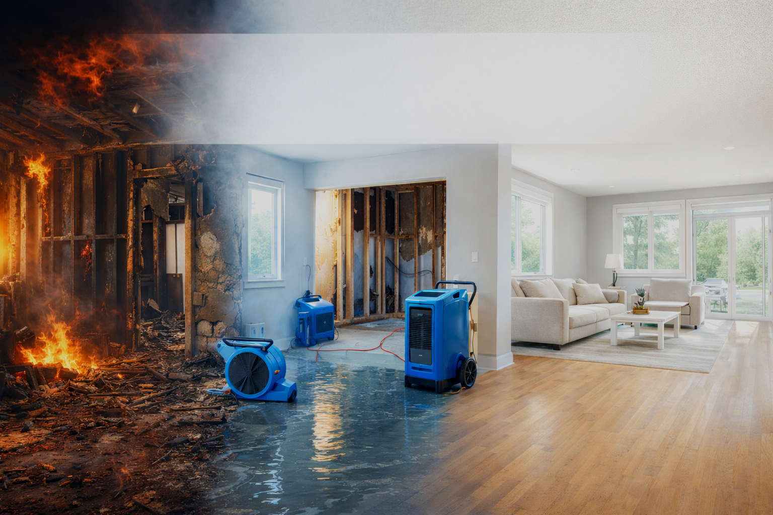 Fire damage goes beyond what burns. Smoke and soot penetrate walls, cabinets, and HVAC systems fast. We contain the damage, remove debris, deodorize, and restore your property from demo to rebuild